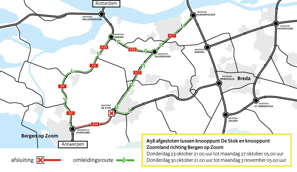 Verkeer wordt omgeleid via de A17, A59 en A4. Weggebruikers moeten rekening houden met een extra reistijd die kan oplopen tot een half uur.